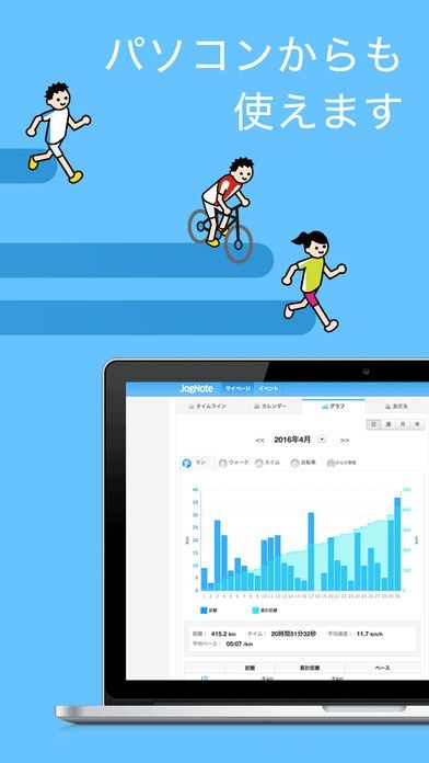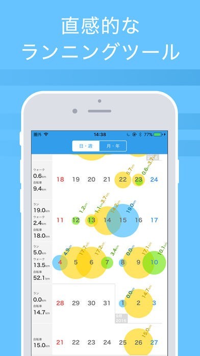 カレンダーやグラフで走行距離や体重、消費カロリーを分かりやすく表示!