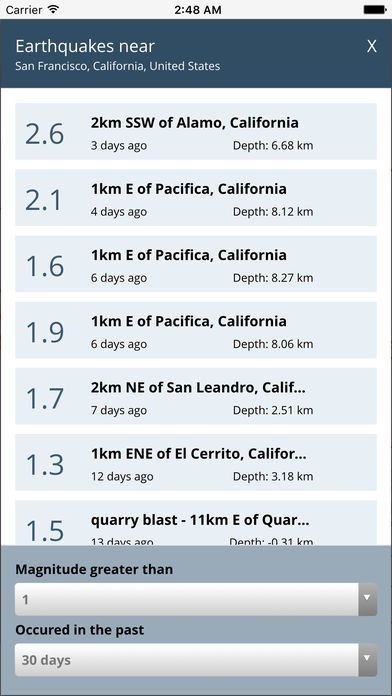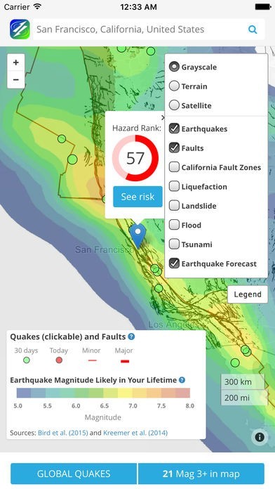 In Temblor’s map you can see the faults and recent quakes around you; use your current location or enter an address. Temblor typically shows magnitude-1.0 or larger quakes in the U.S, and magnitude-4.5 or larger in the rest of the world; the quakes are updated every few minutes. You can click on any quake for more information. Everything is identified in map legends.