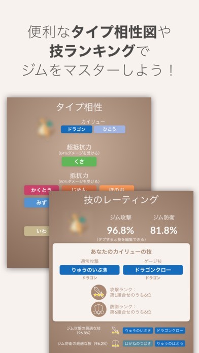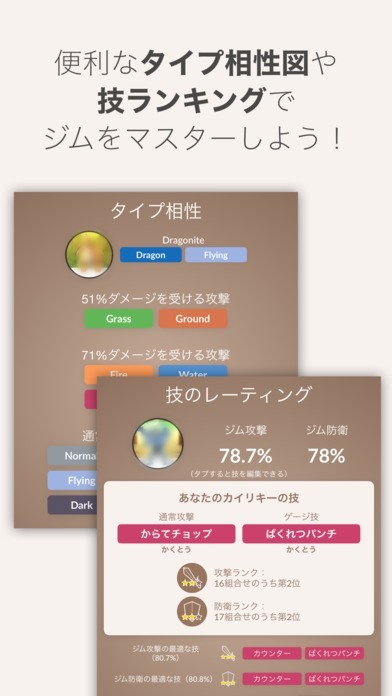 ・ポケモンの技もレーティングされて、ジム攻撃とジム防衛のランキングが表示できる