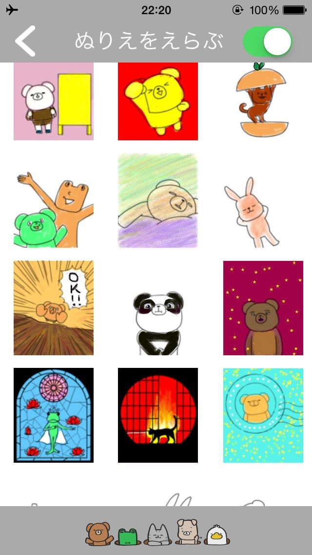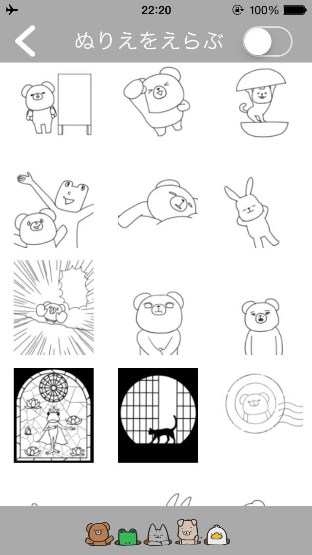 くまぬりえは、クマの下絵に筆で描いたようなタッチで塗り絵を楽しむことができます。下絵は、一覧から好きなものを選びます。塗ったものを塗った状態で一覧に表示したいときは、右上のスイッチを切り替えます。下絵は約400種あり、シンプルでシュールな塗り絵です。絵の具で塗っている感覚で、筆のかすれ具合が再現されています。きれいに塗れなくても味わい深い仕上がりになります。小さな子供から大人まで楽しめます。保存機能で、塗り絵は自動で保存されるので、時間をかけて大きな作品にも挑戦できます。
