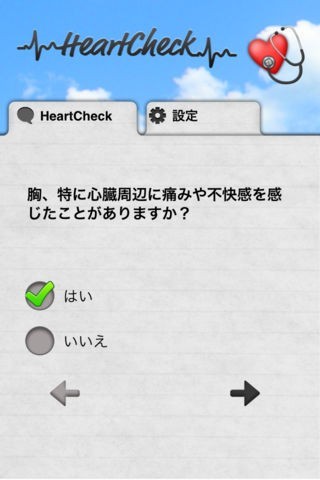 このアプリのアンケートはシンプルなものとなっており、「はい」か「いいえ」、またはどれくらいお酒を飲んだかという数個の選択肢にチェックを入れるだけで心臓発作のリスクを知ることができる簡単なアンケート機能となっています。