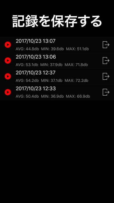 騒音を計測した後は、音や数値をデータとして保存できます。保存したデータは日付と時間ごとに分かれているので、後で探す時も簡単に見つかります。録音した音をエクスポートすることも可能です。