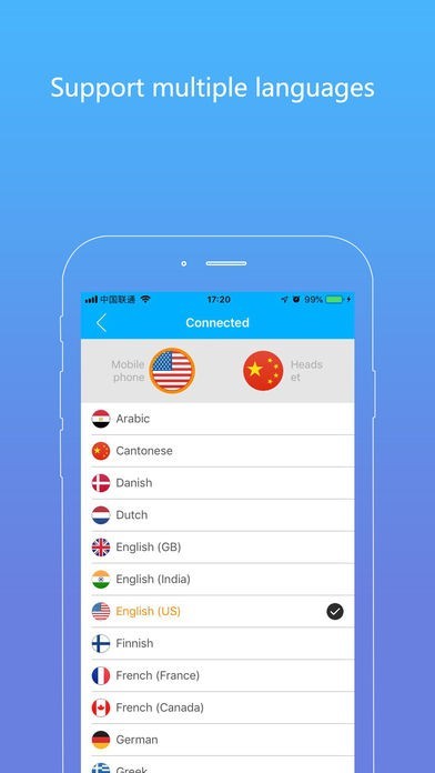 Arabic, English (UK), English (United States), English (India), French, German, Italian, Japanese, Korean, Mandarin, Portuguese, Russian, Spanish, Finnish, Danish, Dutch, Swedish , Polish, Turkish, Thai, Cantonese, Romanian