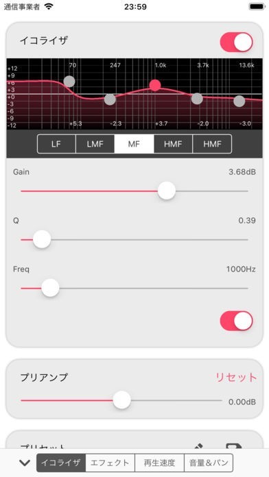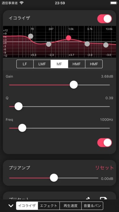 App Storeより引用パラメトリック・イコライザ搭載の音楽プレーヤです。