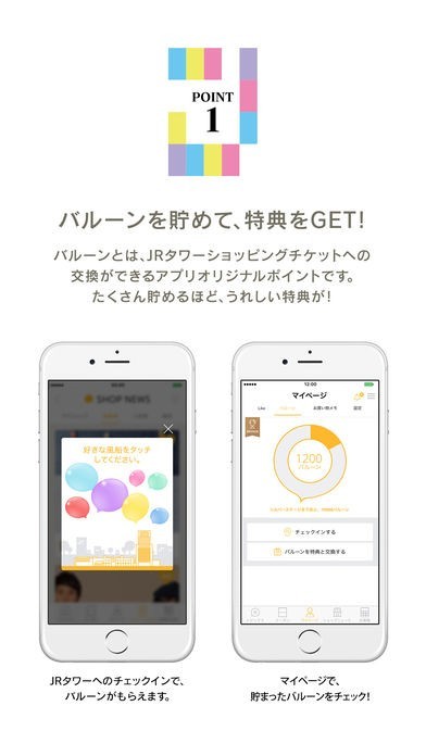 バルーンとは、JRタワーショッピングチケットへの交換ができるアプリオリジナルポイントです。たくさん貯めるほど、うれしい特典が!