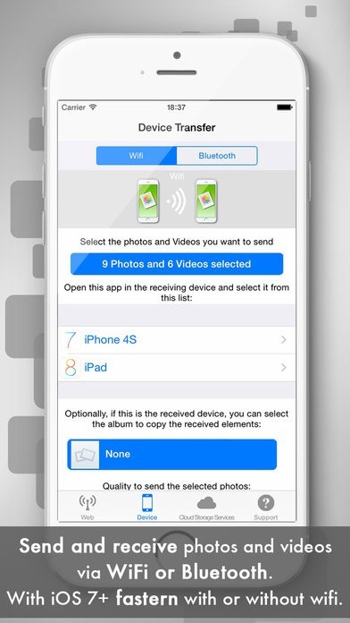 -- Transfer photos & videos between iPhone, iPad or iPod Touch devices, using Wi-Fi or Bluetooth.
