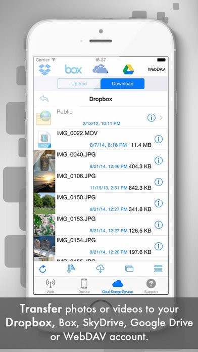 -- Cloud Services for Transfer & Backup: Dropbox, Google Drive, Mega, OneDrive and Box. Download Folders with Photos or Videos. Add multiple accounts for Dropbox, GoogleDrive and Mega.