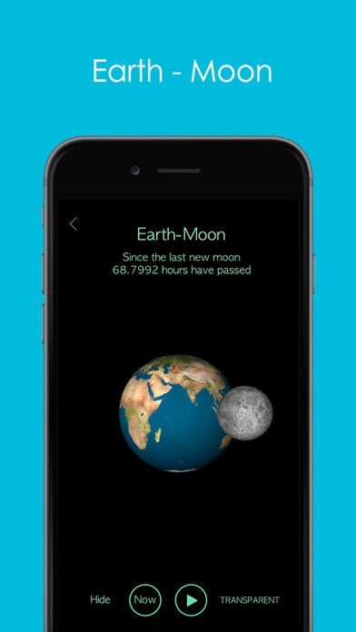 アプリでは月と地球の位置関係を確認することができます。今日の位置関係、100年前の位置関係、未来の位置関係など、密接な関係にある両者の位置を時間ごとに追っていきましょう。理科や天文学の勉強に最適です。