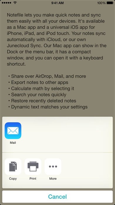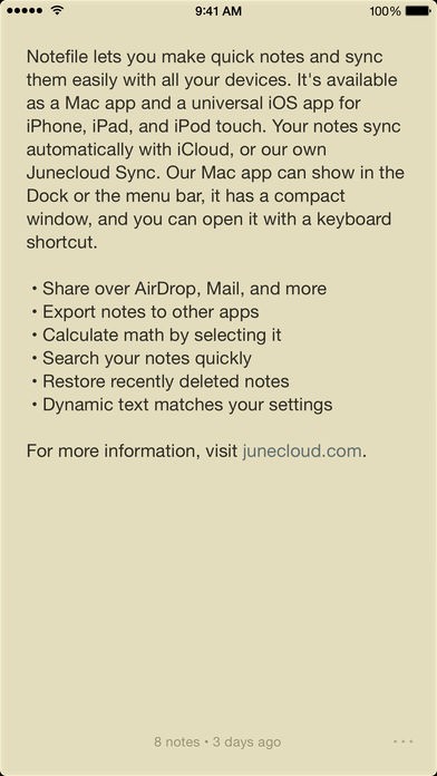 App Storeより引用Notefile lets you make quick notes and sync them easily with all your devices. It's available as a Mac app and a universal iOS app for iPhone, iPad, and iPod touch. Your notes sync automatically with iCloud, or our own Junecloud Sync. Our Mac app can show in the Dock or the menu bar, it has a compact window, and you can open it with a keyboard shortcut. If you use Junecloud sync, you can also view and edit your notes on our web site at junecloud.com/sync