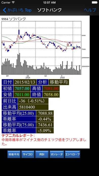 分析した日付の株価の4本値や出来高、テクニカル分析指標名、移動平均線分析であれば、25日ベースと75日ベース、それぞれの移動平均乖離率などを1画面で総チェックできるのが便利です。下方に表示されたテクニカル分析指標名をタップするだけで簡単に分析手法を切り替えることができるようになっています。