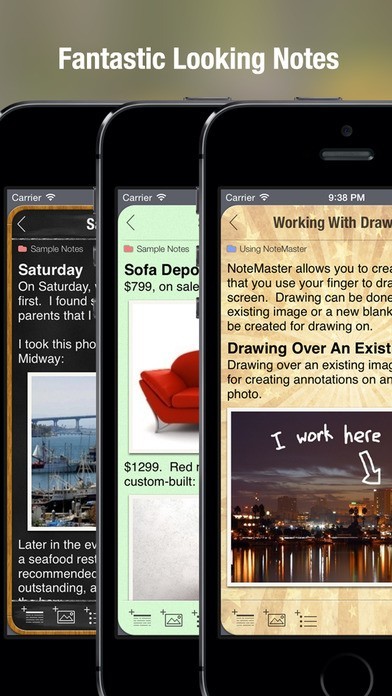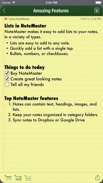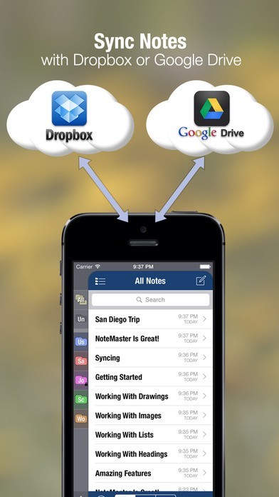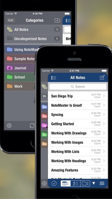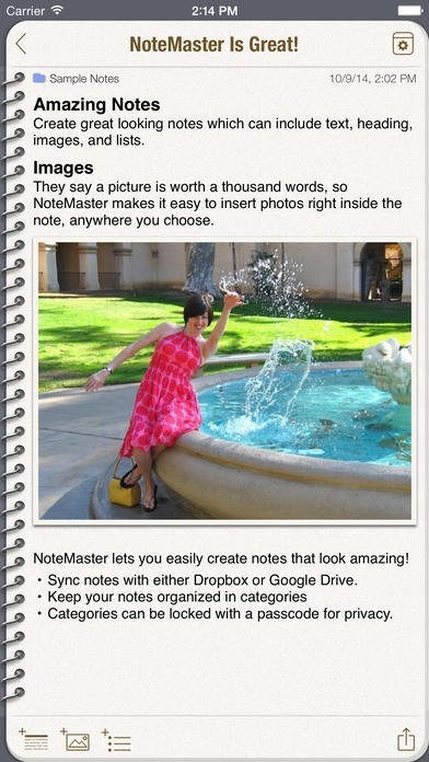 「NoteMaster Lite」は、テキストや画像などの多彩なフォーマットに対応した高機能なメモツールです。メモ機能ではテキスト入力はもちろんのこと、文章に合わせて画像の挿入も可能。プロジェクトで利用する画像を資料として張り付けたり、家族や友達の写真を挿入して自分だけの日記を作ったりと、アイディア次第で活用することができるでしょう。箇条書きリスト機能を使えば、買い物リストやタスクリストとして利用できるのも便利なポイント。さらに使い勝手抜群のSYNC機能も充実しており、Dropboxなどのオンラインストレージとの連携も行えるため、万が一の場合のバックアップも安心です。