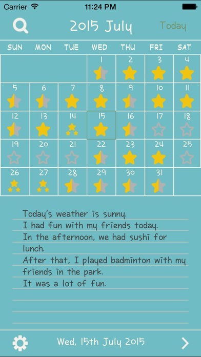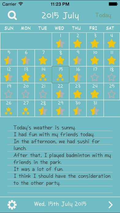 カレンダー画面の日付の部分に星が書いてあり、その日に書いた文の量わかります。4段階でわけられるので、特別なことがあった日がすぐに確認できますし、読み返す時も便利です。