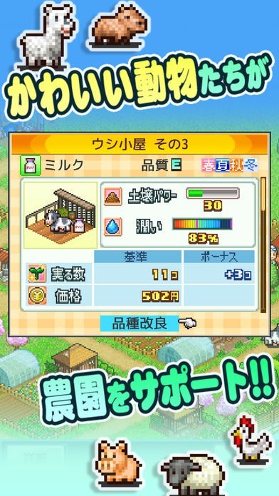 農場してみたいけれど都会じゃ難しい、簡単にはできない方、脱サラして農場を考えている方にとってもお役立ちな本格農場ゲームが味わえる仕様が施されています。野菜を品種改良して新ブランドを作ることもできるので自分だけのオリジナル野菜、くだもの作りに興味がある方もこれでシミュレーションしてみるものいいですね!