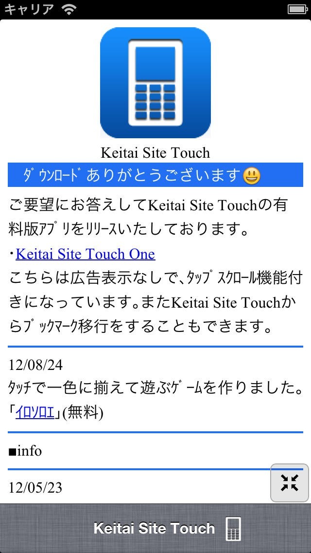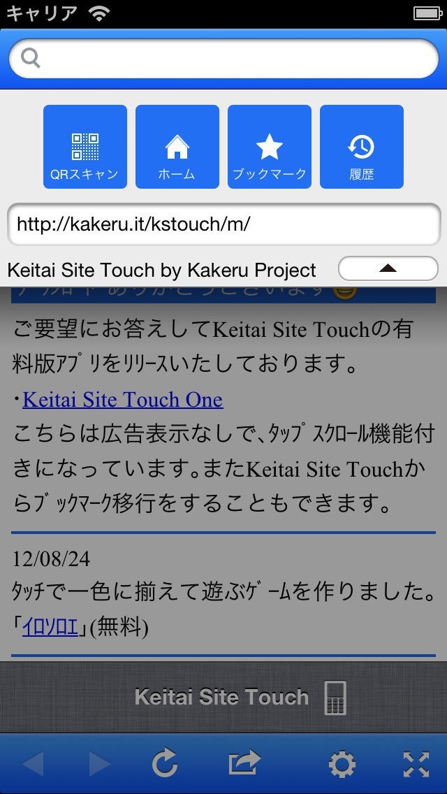 「Keitai Site Touch」を使うことによって、今は珍しくてなかなか見ることが出来ない、携帯用のサイトを見れるようになります。よって、昔よく見ていた懐かしいサイトを見たいというような場合に役に立ちます。 また、それらはブックマークに登録することが出来るので、定期的にチェックすることも簡単に行なえます。さらには、QRコードリーダーもついていることから、iphoneでは少し読み取るのに苦労するものをしっかりと読み取り加えてサイトにアクセスしたり、アプリをダウンロードしたりすることが出来ます。