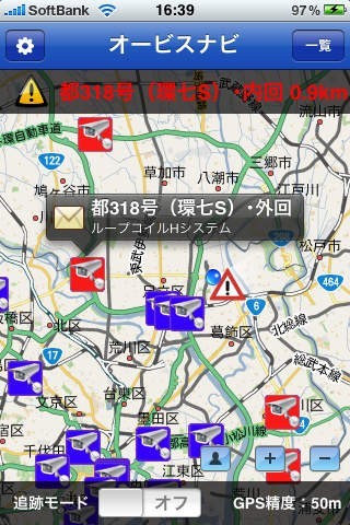 3. 設定されたアラーム範囲により、アラーム音を出し、該当オービスの文字色やマップ上のアイコンも変わる