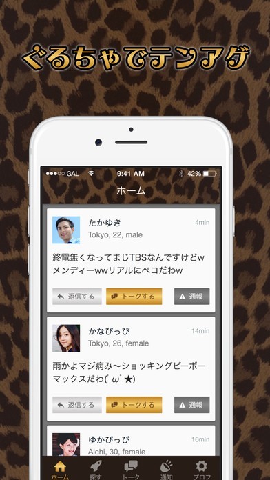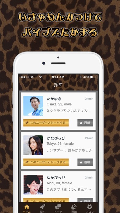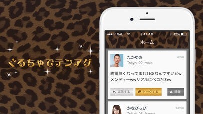 「ギャル友フレンドチャット - ギャルトーク (GALTALK)」は、ギャルやギャル男専門の友達募集アプリです。 最初に自分のプロフィールを登録しますが、ニックネームや住んでいる場所、年齢等の簡単な内容しか入力しないので、個人が特定される事はありません。 ホーム画面では、暇をしているギャルやギャル男のつぶやきが表示されています。好みの人に気軽にトークを送り、会話を楽しむ事が出来ます。 検索機能では、年齢幅や性別を指定してユーザーを検索する事が可能です。 また、足あと機能が搭載されており、あなたのプロフィールが気になって見に来た方を確認する事が可能です。