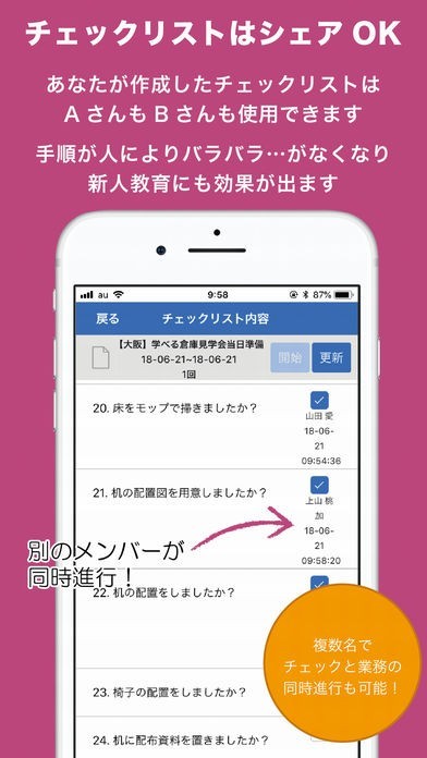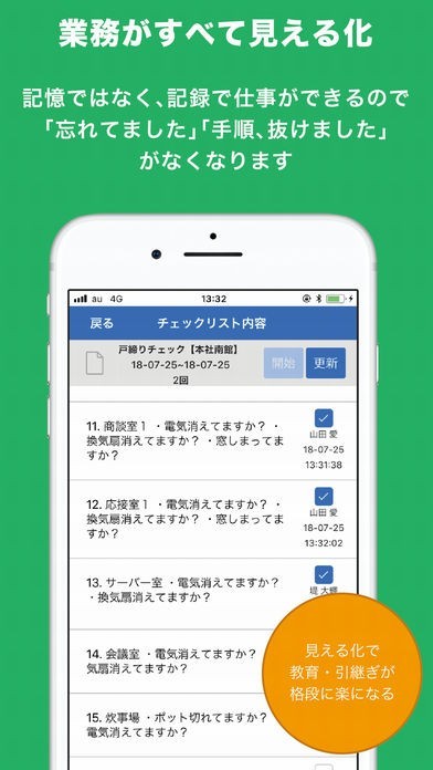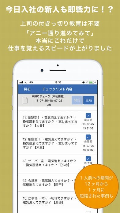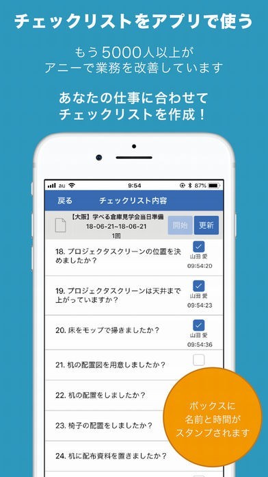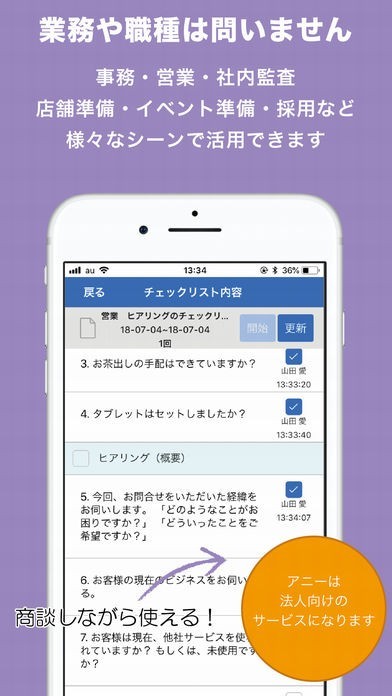 App Storeより引用アニーはチェックリスト型のマニュアル作成ツールです。 クラウド型のシステムなので、いつでも・どこでも・誰でも共通のマニュアルを使用することが可能です。 業務マニュアルをチェックリストにして登録します。 文章型ではなく、チェックリストにすることで、既存のノウハウやあらゆる手順が見える化され、ヌケモレがなくなります。引き継時の品質も落としません。 特に、教育や異動の引継ぎに活用すると効果的です。 アニーを使い、仕事の効率化、品質向上を実感している企業が増えています。