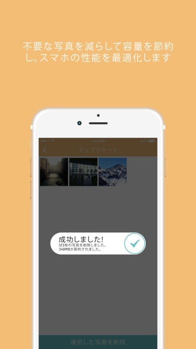 貯まった写真を整理したいが、わざわざ探し出して削除するのが面倒という時に便利なのがこのアプリです。 アルゴリズムにより自動的に判断する仕組みになっており、手間を掛けずにスマホのデータ容量節約が行えます。 毎分900枚以上と高速に処理することが可能、写真をたくさん撮るという方に便利なアプリになっています。 アプリを使用しても外部のサーバーへバックアップされることはありません。 スマホのカメラロールに人に見られたくない写真が入っているという方でも安心です。 ネットの繋がらない場所でもアプリを使用することが可能です。