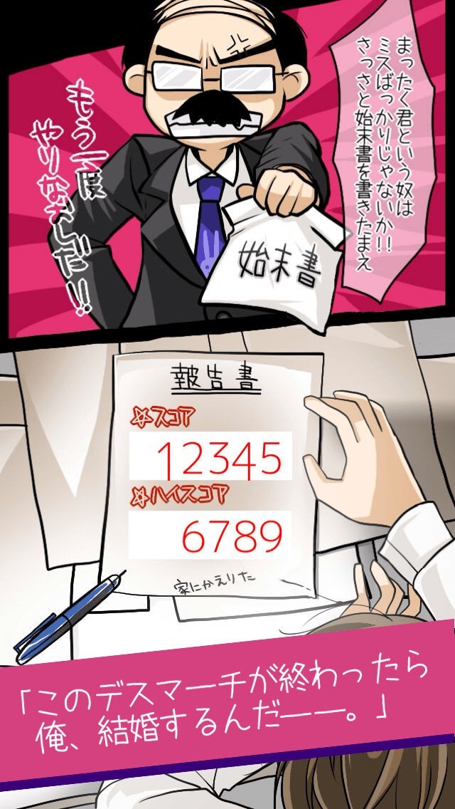納期タイトなデスマーチから抜け出し、プロジェクトを完了させよう! 仕事なんて。と思いつつも気が付けばオーバーワークでゾンビと化しつつも、労働し続ける社畜社員。 そんな社畜社員が、うるさい上司と自由すぎる女子社員に邪魔されながら、黙々と資料を片付けハイスコアを狙う労働ゲームです。 次々に回ってくる資料を左スワイプで片付けていきます。不要資料はダストボックスめがけて下スワイプ。 労働を邪魔する上司や女性社員をタップで撃退しながら、たまった資料を完成してデスマーチを乗り切りましょう。 暇つぶしにおすすめの無料ゲームアプリです。