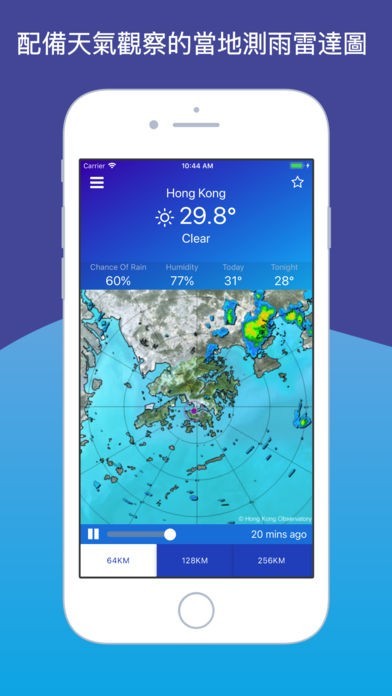 App Storeより引用香港本地測雨雷達與精準的天氣預報,整合在單一檢視圖中。設計精美,簡單易用。