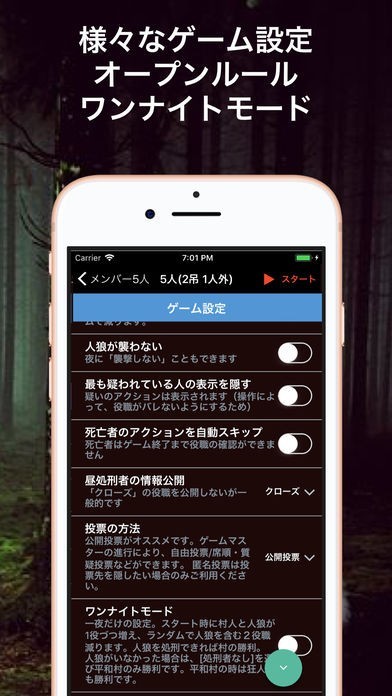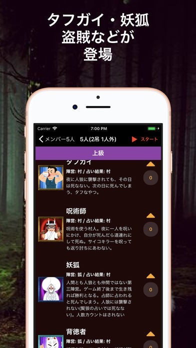 人狼ゲームでよく使われる村人や占い師などの標準役職だけでなく、タフガイや盗賊など多彩な上級役職が用意されているので、好きな役職を選んでより複雑なゲーム性を楽しむことができます。