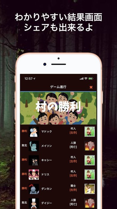 ゲームの結果画面では勝敗や誰がどの役職だったかが一覧で表示されているので、すぐに結果を確認することができます。結果画面をシェアすることも可能なので、みんなで一斉に見られます。