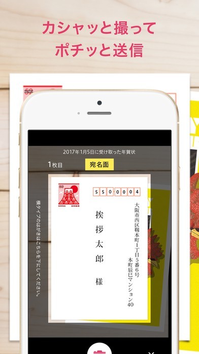 年賀状の宛名、絵柄を撮影し、住所氏名をデータ化、デザイン面をスマホ上に管理できる