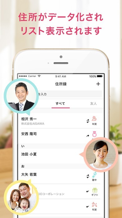 カシャポ - 年賀状をスマホで簡単整理は年賀状をスマートフォン上で整理・管理のできるアプリで、宛名の面と通信面を撮影して宛名と住所はOCR機能で読み取り、データベース化することが可能です。また、通信面に書かれたイラストなどもスマートフォン上で閲覧できるため、スマートフォンを年賀状のアルバムとして機能させることが出来ます。もちろん年賀状だけではなくハガキであればデータ登録などは可能です。ただし、登録した住所を別の年賀状の印刷のために使ったり、住所データを他のアプリでの使用はできません。そのため年賀状や季節のお便りなどをスマートフォン上でまとめ読み・保管するのに向いたアプリとなっています。