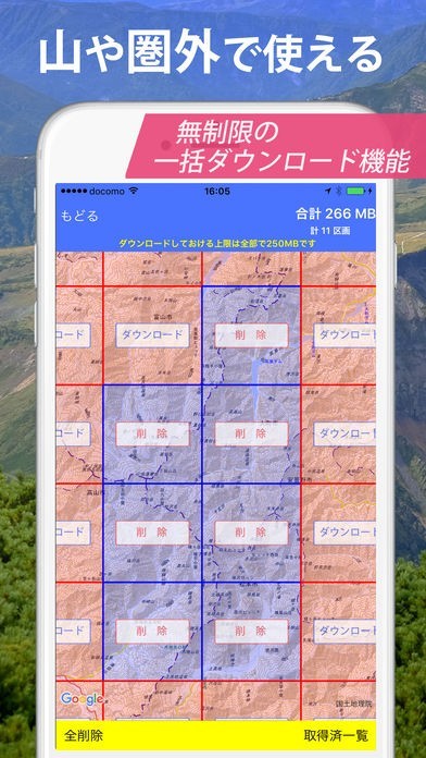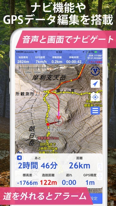地形好きにはたまらない、地形にこだわった3D地図、GPS対応しているので登山にも使えるアプリです。オフラインでGPSが使えるので山の中でも利用できます。ナビ機能が付いており、音声とガイドでナビゲートしてくれ、道を外れるとアラーム音が鳴ります。登山初心者や初めて登る山に不安がある方にも使いやすいアプリです。古地図など100種類の地図が用意されているので、自宅で地図を見て楽しむこともできます。アプリを使えばきっと良さを実感できることでしょう。