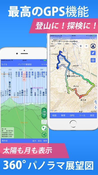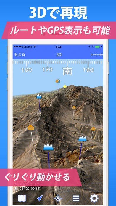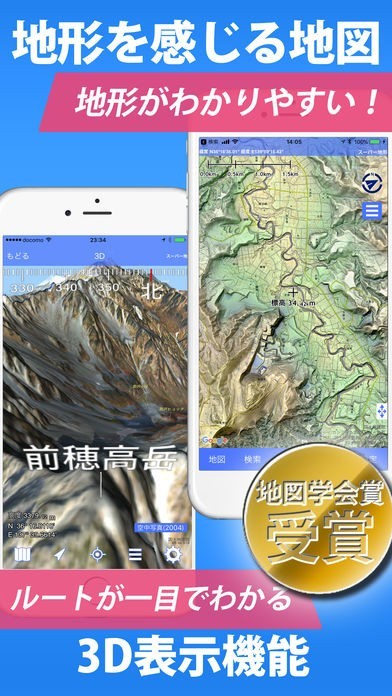 山の起伏や高低差をハッキリと表す3D地図が見れるアプリです。電波がないところでもGPS機能が使えるので、登山にも最適。登山ルートのナビゲート機能もあり、道をそれるとアラームが鳴るなど、使い勝手が良いアプリとなっています。