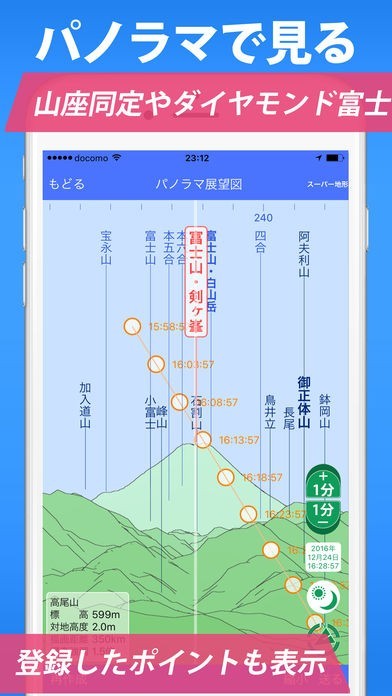 360℃展望パノラマが搭載されており、山だけでなく太陽や月の位置も確認可能