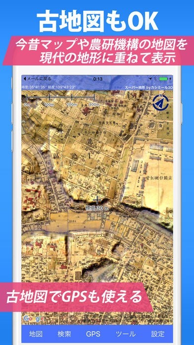 3D地図だけでなく、古地図や空中写、植生図等100種類もの地図が搭載されています。海面が上昇したらどの位置まで上昇するのかシュミレーションする機能もあり、様々な趣味や研究に役立つアプリです。
