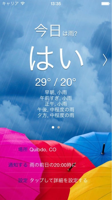 雨予報を知りたい場所の状況をリアルタイムに知ることができます。雨が降るかどうかをハッキリ表示してくれるので、外出も安心です。傘を持って行くかどうか迷うことがなくなります。