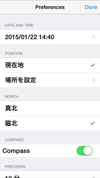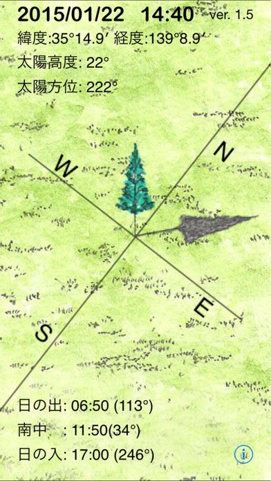 太陽の方位角と高度を任意の時間で表示させる事ができて何時に太陽がどの方角にあるか全く分からない時でも時間を指定する事で正しい太陽の方角が分かるようになっているのが良いです。