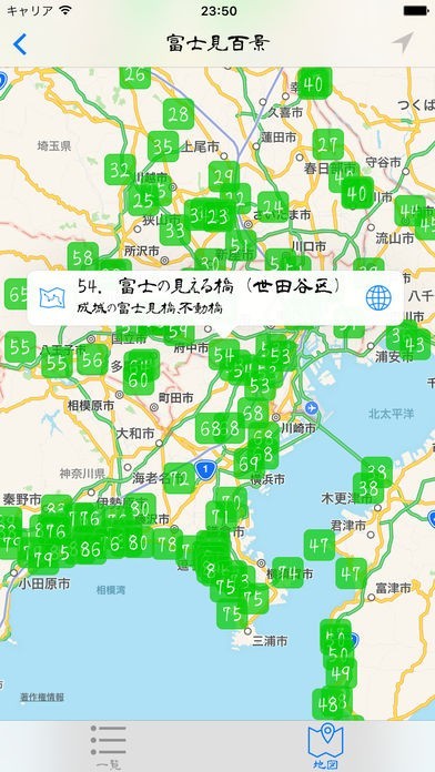 App Storeより引用富士山への良好な眺望が得られる128景233地点を収録したアプリです。