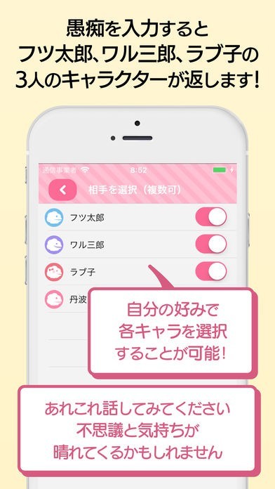 あなたの性格やその時の気分に合わせて使えるよう、性格の異なる3人のキャラクターが用意されています。3人全員と一気に話すことも、1人を選んで会話することも可能です。