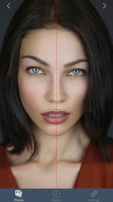 「FaceSym - フェイシャル対称性テスト」は、自分の顔が完全な左右対称であった場合にどのように見えるかをテストすることができるアプリになります。アプリを起動して撮影した顔写真だけでなく、カメラロールに保存してある写真を利用することも可能となっていて、テストの結果をインスタグラムで共有することもできます。