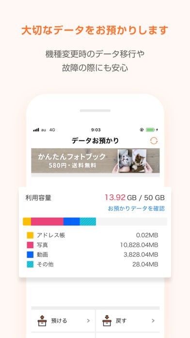 auユーザーに役立つアプリで、電話帳など保存しておきたいデータを、このアプリだけで簡単にネット上に保存できます。パッと預けたり戻したりできるので、便利です。