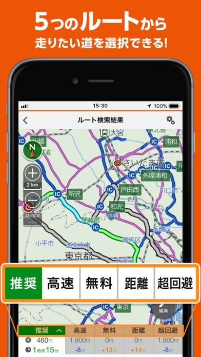高速・一般道路、渋滞回避など、目的に応じて5つの中からルートを選択!