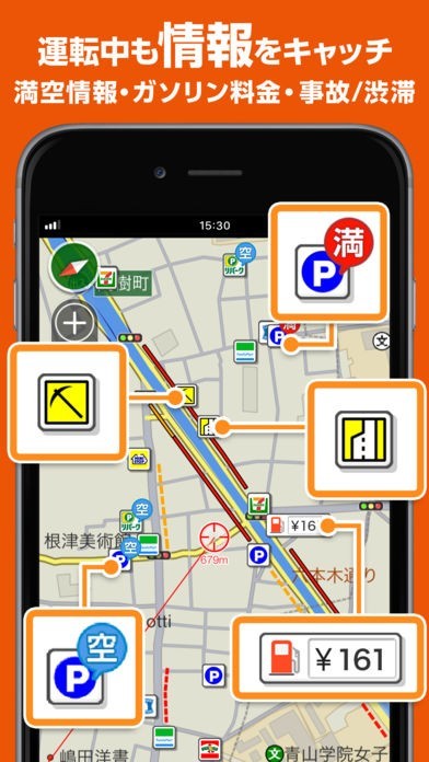 目的地周辺の駐車場の詳細情報やガソリン料金など役立つ情報満載のナビアプリ
