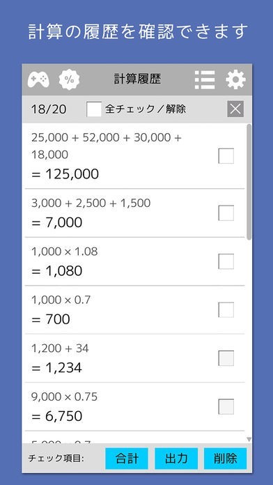 計算機++無料版 ワンタッチで消費税と割引計算が出来る電卓は、算出履歴を用いる事で計算効率を上げたり、走り書きを行わずに済む便利なアプリの事です。履歴の式が各数値毎に空白が設けられて、はっきりとアップされるので、詳しく確認する事が出来ます。履歴画面を開く事で、それぞれの解答同士による総合数字を細かく求める事が可能です。総合計での明確な数値をチェック出来る為、誤る事なくきちんと把握する事も可能です。数式は書き込む度に記憶されているので、何らかの都合によりアプリを一時停止したり、完全に閉じてしまっても、計算を再びスムーズに始める事が出来ます。