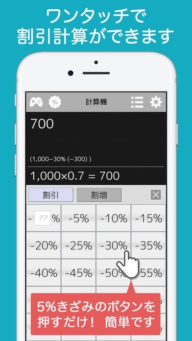 予め何パターンも割引率のボタンが用意されているので、10%でも25%でも一発で答えが分かります。表示画面が大きくて、式が長くなってもちゃんと確認しながら計算が可能です。