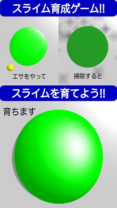 スライム!!は、エサを上げたり周りを掃除したりしながらスライムのお世話をして育てていきます。画面をタッチすると運動します。触った時のリアクションや触感を楽しめ、愛着がわいてきます。
