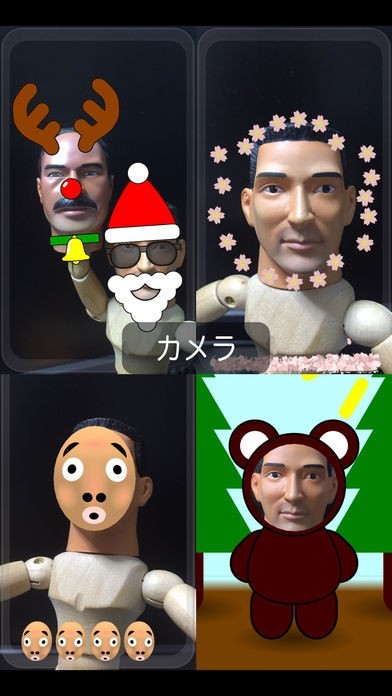 カメラをオンにして、合成写真撮影/自撮りもできます。顔認識で顔ハメや桜、星、クラゲなどのデコレーション写真も撮れます。