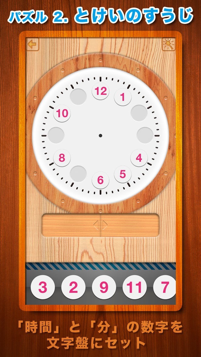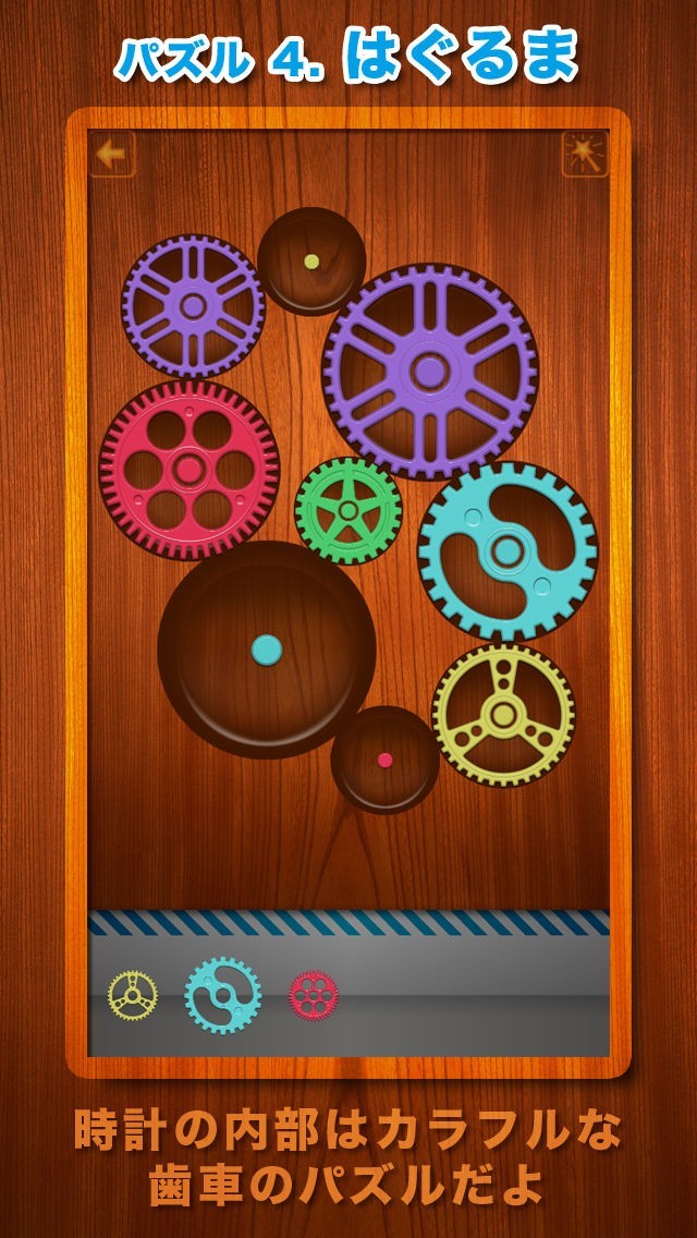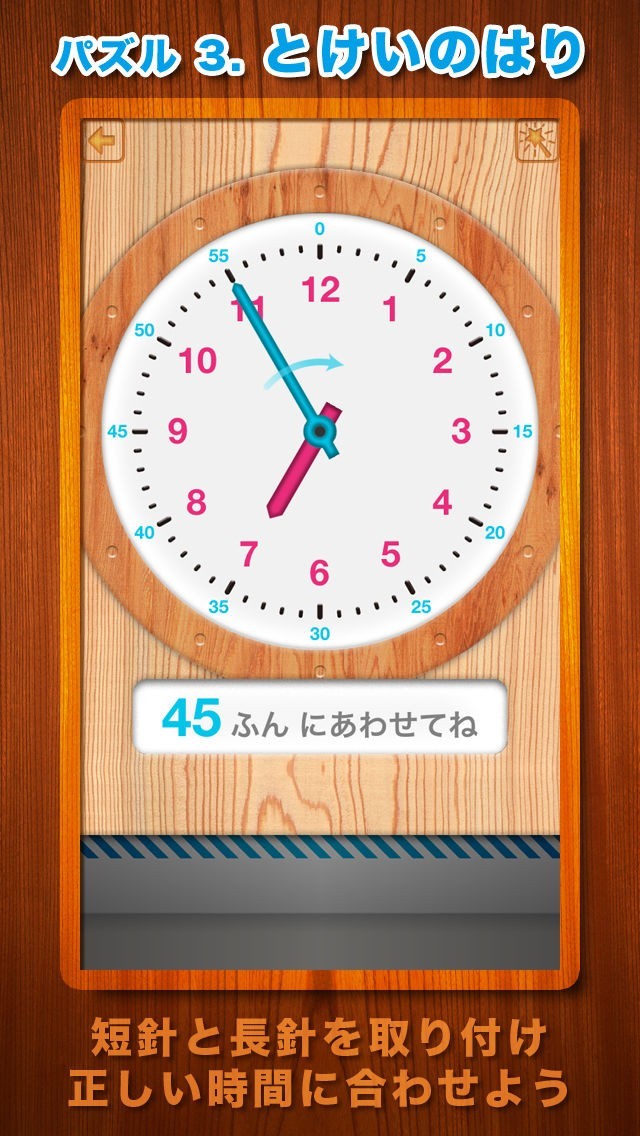 このアプリではまず、時計盤をパズルのように完成させるということによって、想像力をつけることができます。 また、数字を正しい順番に並べることによって、数をしっかりと数えることが可能となります。さらには短針と長針をとりつけで、指定された時間に合わせるということによって、時計を見て時間を把握するということが出来るようにしてくれます。 他にも時計の内部の歯車を組み立てることによって、想像力や認識力などを鍛えることが出来、最後に時計を見て何時かを当てるクイズもすることが出来ます。 操作は基本的にはタップやスワイプで行うことが出来ます。 以上のように一つのアプリのみで様々なことを総合的に学習することが出来るので、効率よく短時間で素晴らしい効果が得られることでしょう。