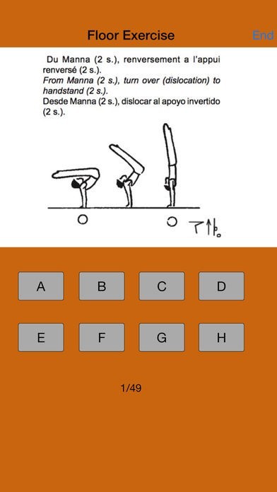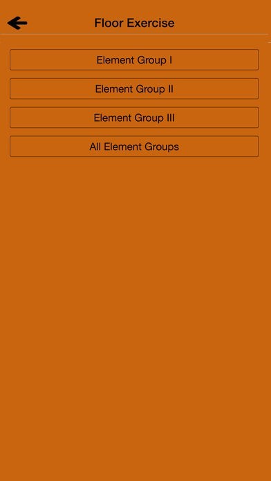 床・平均台・つり輪・跳馬・平行棒・鉄棒の各種目別にそれぞれ要素を3グループに分けて設問が用意されています。全ての要素をまとめて勉強することもできます。それぞれの問題で解説が用意されています。