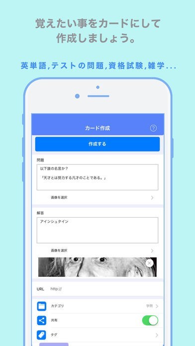 単語系のカードではなくテストを見越して問題を用意できます。問題はクエスチョン部分と解答部分に分かれて入力でき、正答部分を隠して出題可能です。また地理系などにも応用できるよう静止画をつけられます。