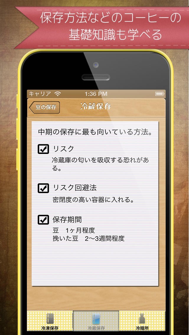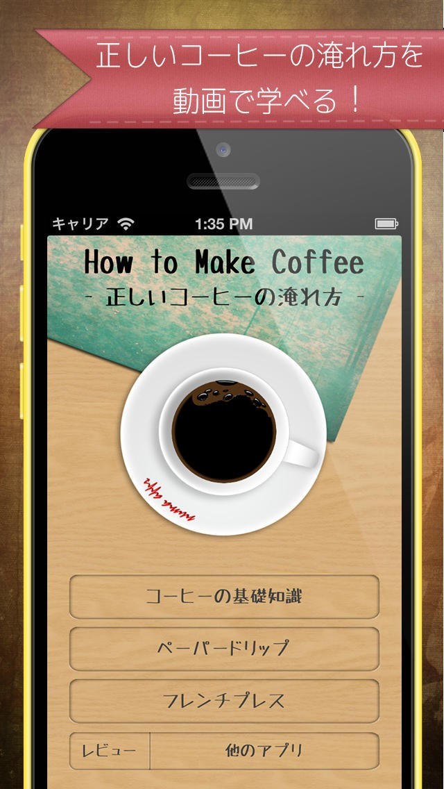 App Storeより引用コーヒー教室は、コーヒーを美味しく入れるためのすべてを内蔵したアプリです。「コーヒーの知識」と「動画での抽出方法の解説」、「便利なタイマー機能」とすべてが1つに収まったアプリです。このアプリを使えば、自宅で香り豊かなコーヒーを楽しむ事が出来ます。
