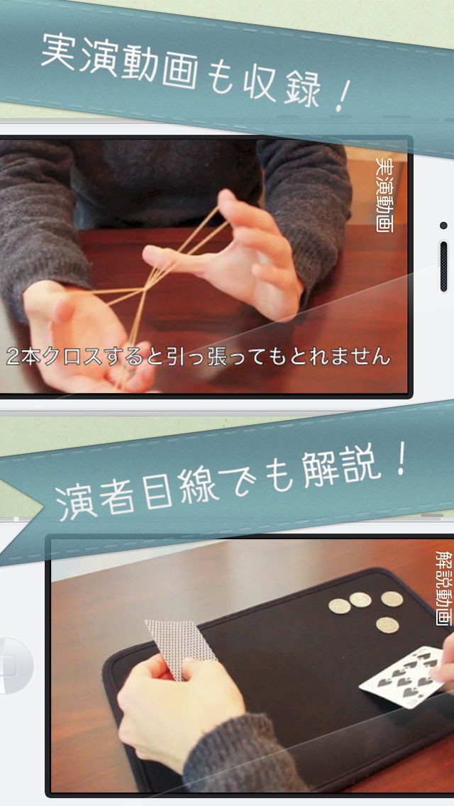 App Storeより引用このアプリはその場にある道具だけで簡単に行うことが出来るマジックを豊富な動画で解説しています。このアプリに収録されているマジックは特別な準備やトランプなどの道具はいりません。