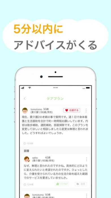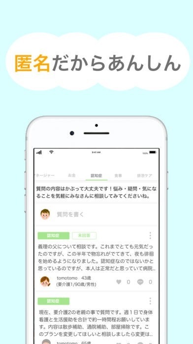介護をする家族が抱える日常の疑問や不安を、匿名で相談できるアプリです。